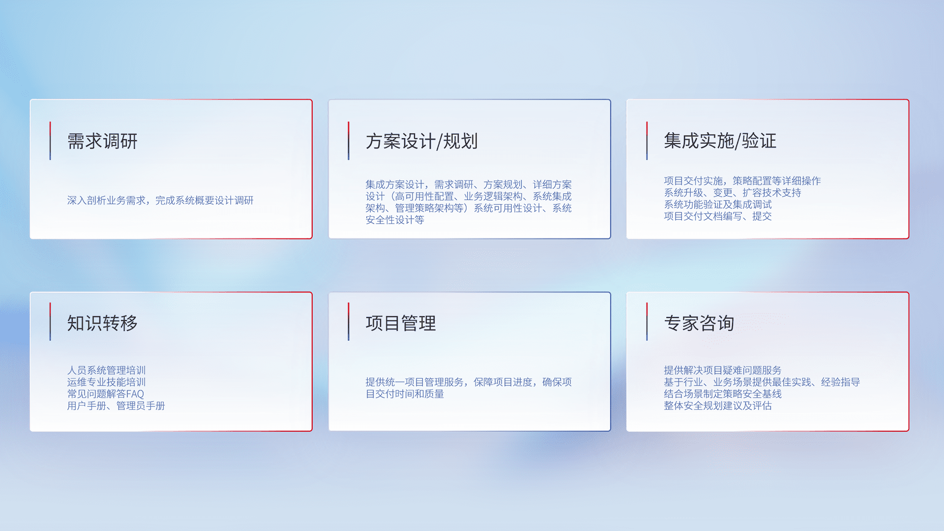 针对客户行业特性,,将宏观的安全战略和需求,,通过专业的交付服务,,,实现项目落地,,,,为客户提供标准规范的集成交付服务。。。